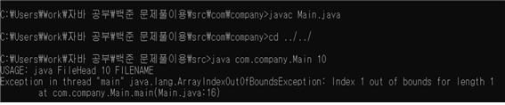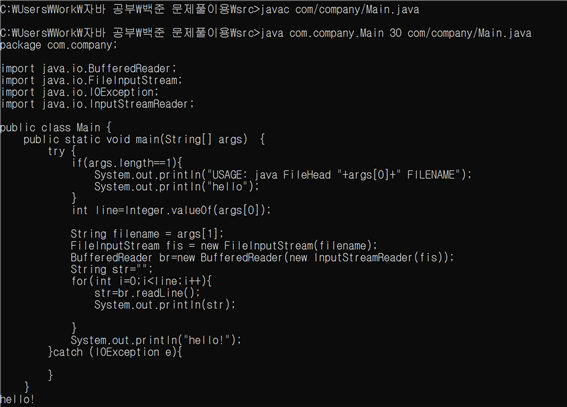 4. 또한 커맨드 라인으로 파일명을 입력해주는 프로그램을 작성 할 시에는(args)함수 이용. 반드시 com/company/Main.java처럼 패키지경로가 포함된(자바파일이 패키지에 포함되어 있다면) 파일명르 써주면 정상적으로 동작한다.