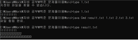 처음 type 연산자를 사용했을때는 src 디렉토리 내에 1.txt라는 파일이 없기 때문에 파일을 찾을수 없었고, (밖의 \백준 문제풀이용 폴더에 있었음) 그것을 src 파일 내로(커맨드 라인이 가리키는 파일경로 내) 이동하니까 바로 실행됨.