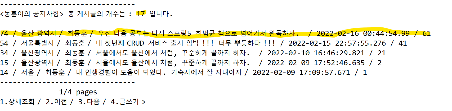 총 페이지수와 게시글 수를 확인 할 수 있고, 페이징 기법을 이용, 사용자가 콘솔에서 이전/다음 페이지 를 선택하여 넘길 수 있다.