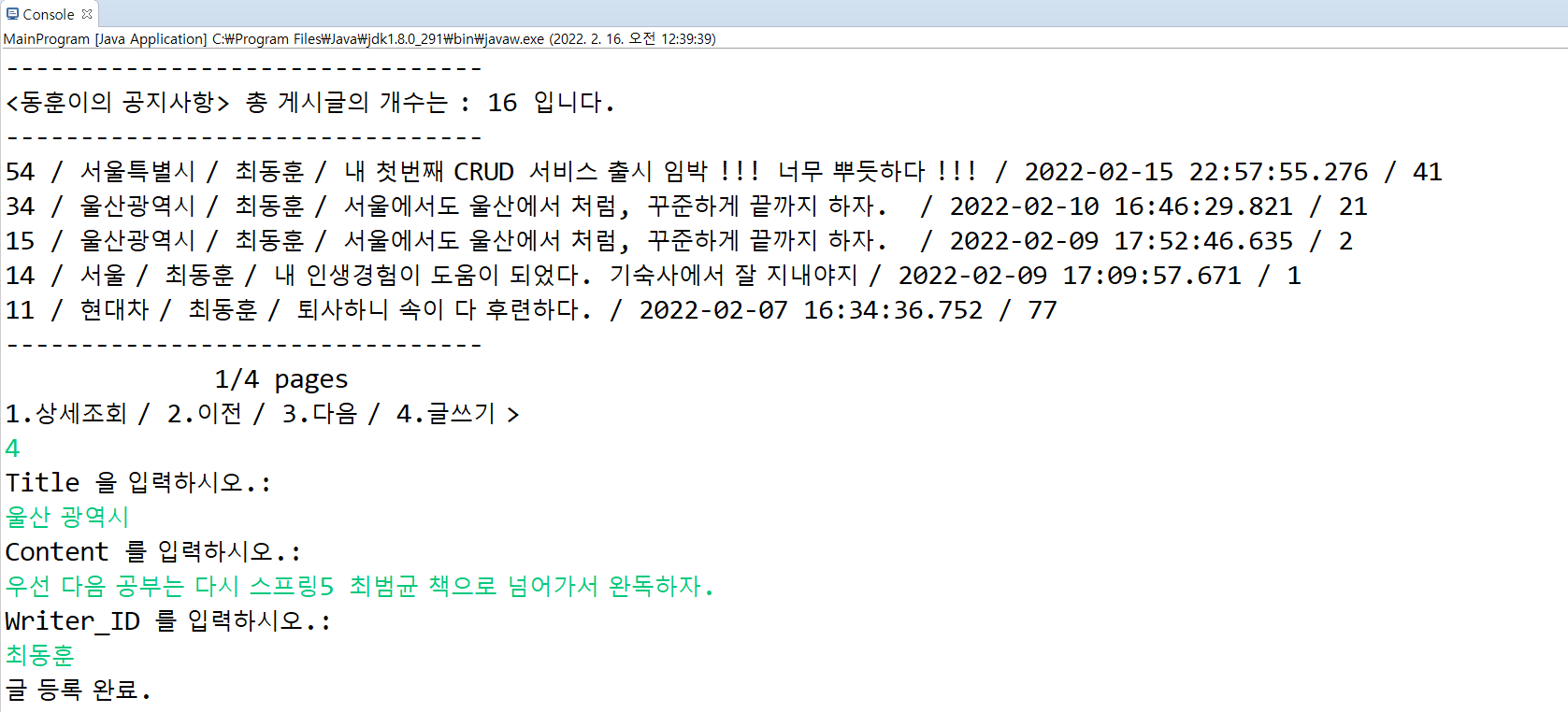이렇게 TITLE, CONTENT, WRITER_ID를 차례로 입력하면, 서버로 쿼리를 날려서 DB에 테이블이 생성된다.