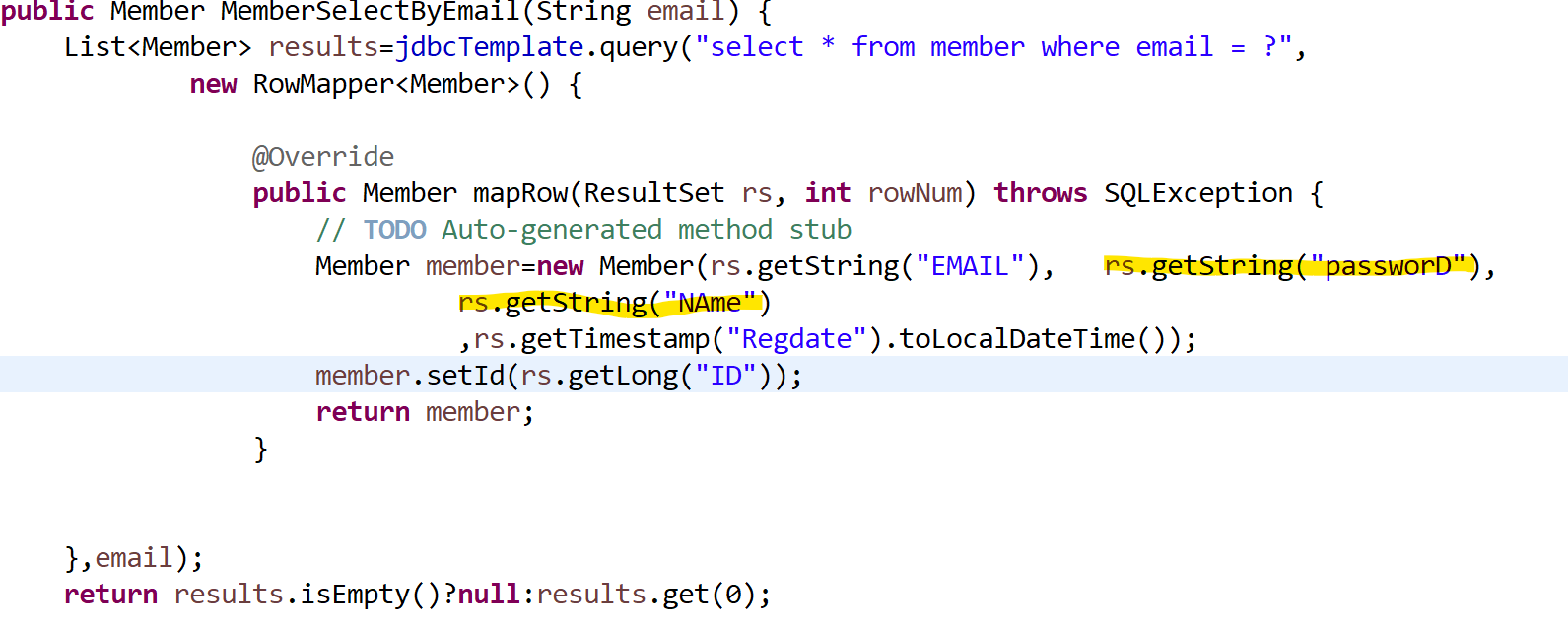 우선 스프링으로 JDBC template를 이용해서, CRUD 서비스를 만드는 중, 분명 SQL 문으로 "Select * from member where Email = ?" 이렇게 잘 작성해서 DB에서 데이터를 뽑아왔다. 그런데, 이상하게 member 객체의 password와 name 멤버가 뒤바뀌어서 나오는 것이다. SQL 구문잘못도 아니고, Member클래스의 생성자를 뒤바꾸게 정의한것도 아니였다.