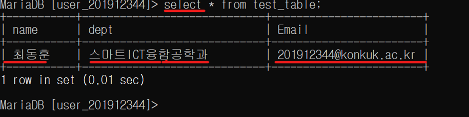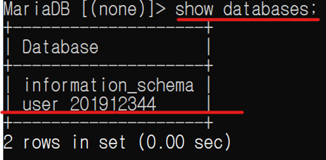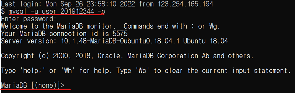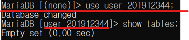 또한 mysql –u user_201912344 –p 명령어를 통해 Mysql에 접속하였다.