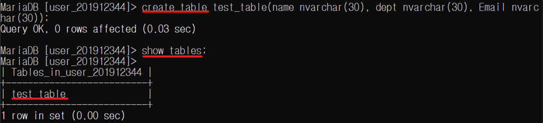 그다음 show 명령어를 사용하여 내가 만든 테이블이 Database 안에 존재하는지 확인하였다.