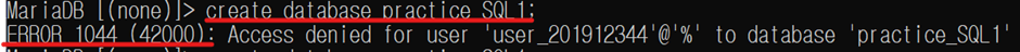 *error 현황: 그 다음에 나는 새로운 연습용(practice_SQL1) 데이터베이스를 만들려고 create database 명령어를 입력했는데, 다음과 같은 에러가 나왔다.
