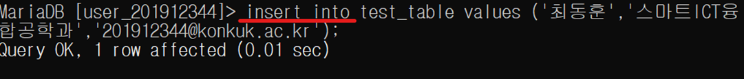 그다음 DML 의 일종인 insert 문을 통해 테이블에 듀플을 삽입한 다음 select 문을 통해 내가 삽입한 듀플을 조회하였다.