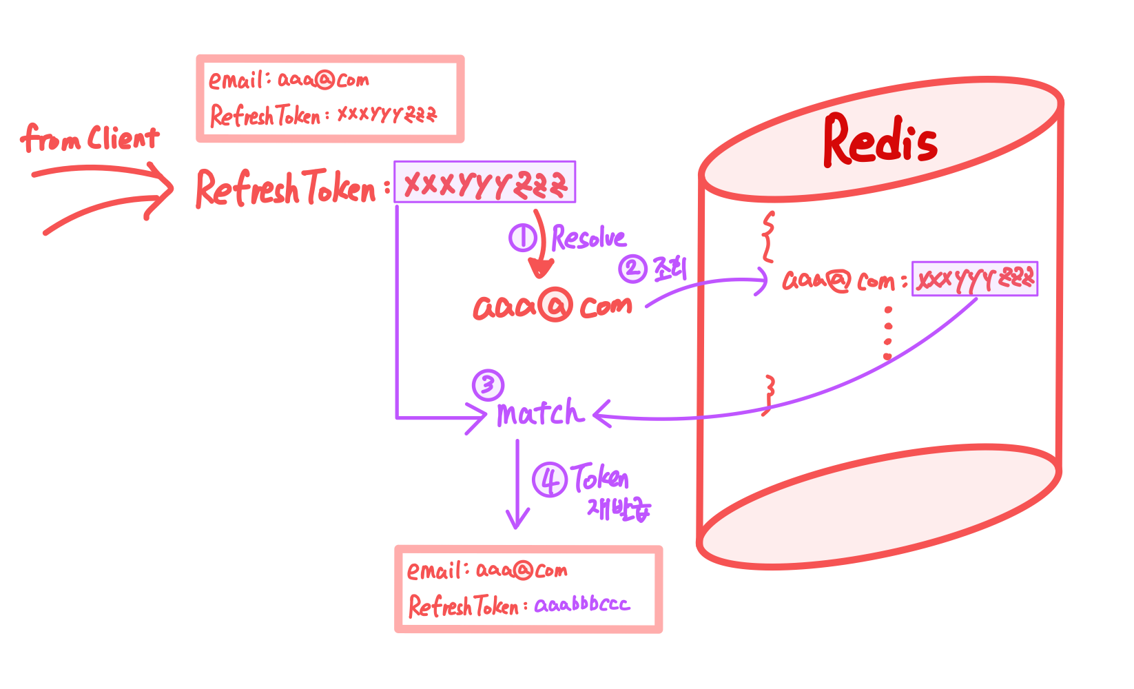 2. user Email을 key로 Redis를 조회하면 이에 대응되는 RT`가 리턴된다.