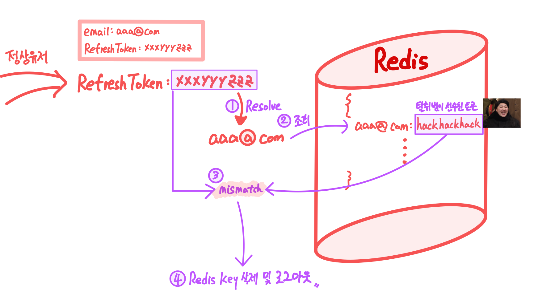 3. Redis에서 조회된 RT`는 해커에 의해 먼저 재발급된 Refresh Token으로, 즉 정상 유저의 Refresh Token과 상이한 값이다. 즉 매칭되지 않는다.