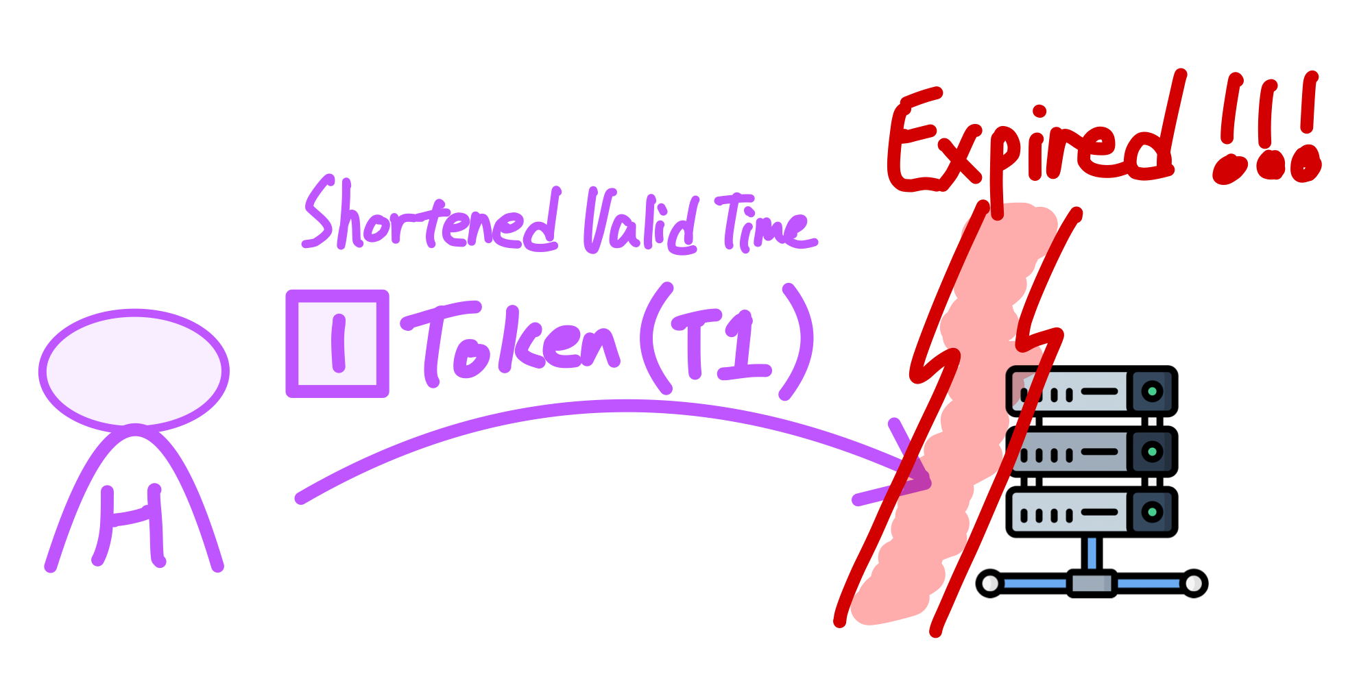 그럼 이 Access Token(T1) 을 해커 H 가 탈취했다고 가정하자. H가 T1을 자신의 Header에 담아 서버에 요청을 보내도, 서버는 A가 아닌 H의 요청이란 걸 알 길이 없다. 이런 문제로 인해 Access Token의 유효기간을 짧게 설정한다. 토큰이 탈취돼도 유효기간이 짧기 때문에 금방 만료되어 더이상 서버에 인증을 할 수 없다.