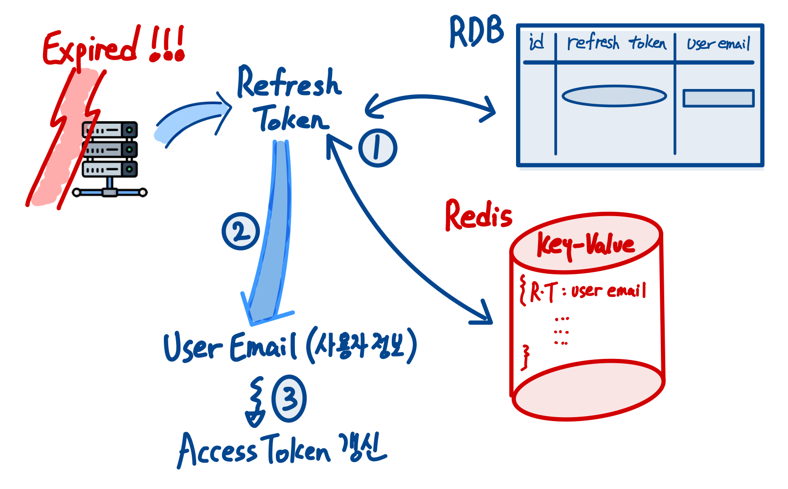 이전까지의 방법과 다른점은 Redis에 저장된 키를 RT가 아닌 userPK(email) 로 했다는 점이다.