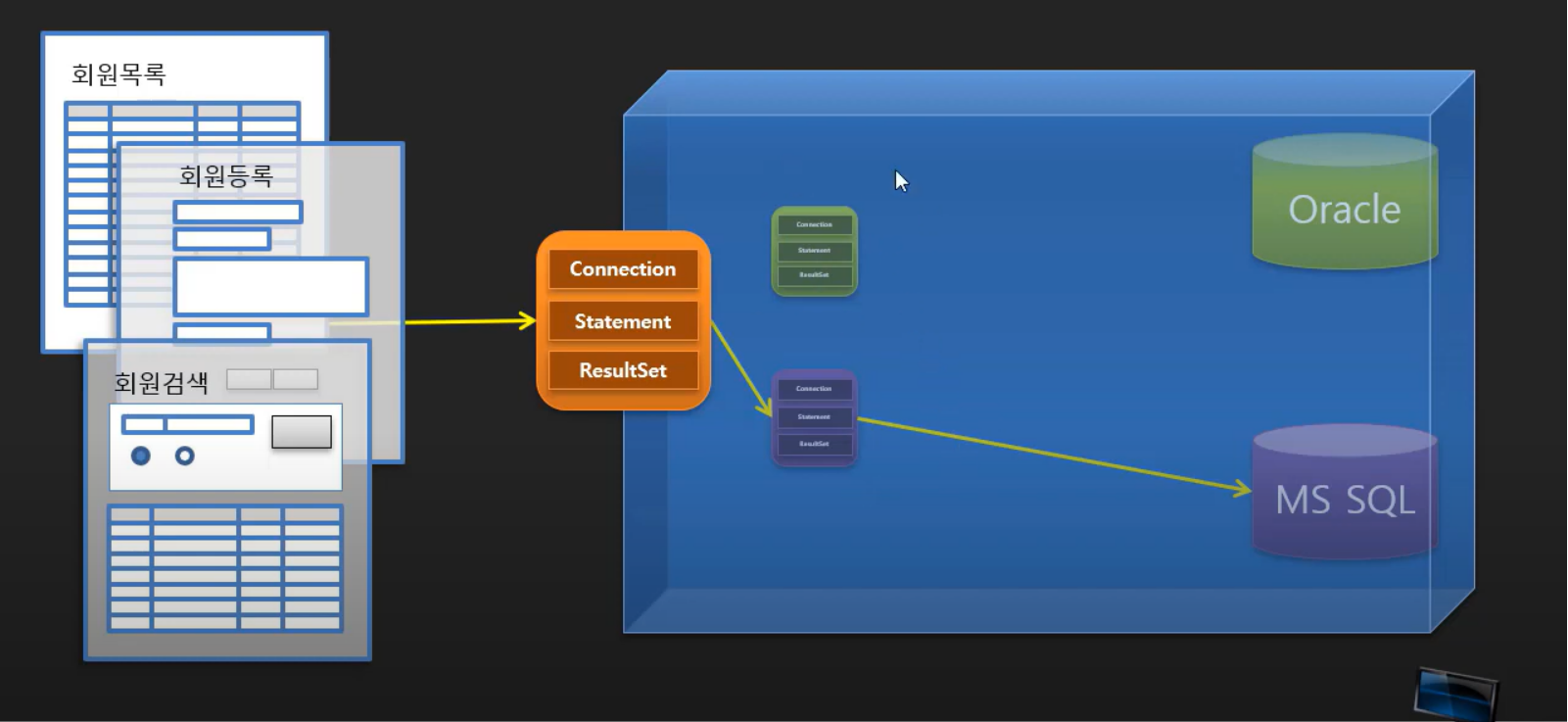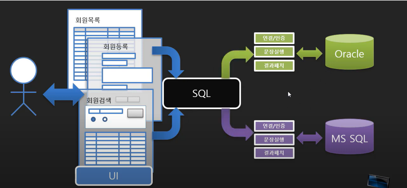 이렇게 사용자가 직접적으로 DB에 쿼리를 날리면, Oracle 따로, MS SQL 따로, 두번 다 각각의 DB함수에 맞게 조정해야한다.