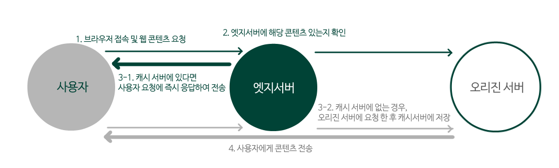 좀 더 자세히 설명하자면 사용자의 물리적 위치와 가까운 엣지(Edge) 서버가 있고, 이는 파일 복사본을 임시로 저장하는 프로세스인 캐싱을 사용합니다. 그렇게 캐시된 웹 콘텐츠를 전송함으로써 전송 속도를 높이게 되고, 사용자는 콘텐츠가 로딩될 때까지 기다릴 필요가 없게 되는 것입니다.