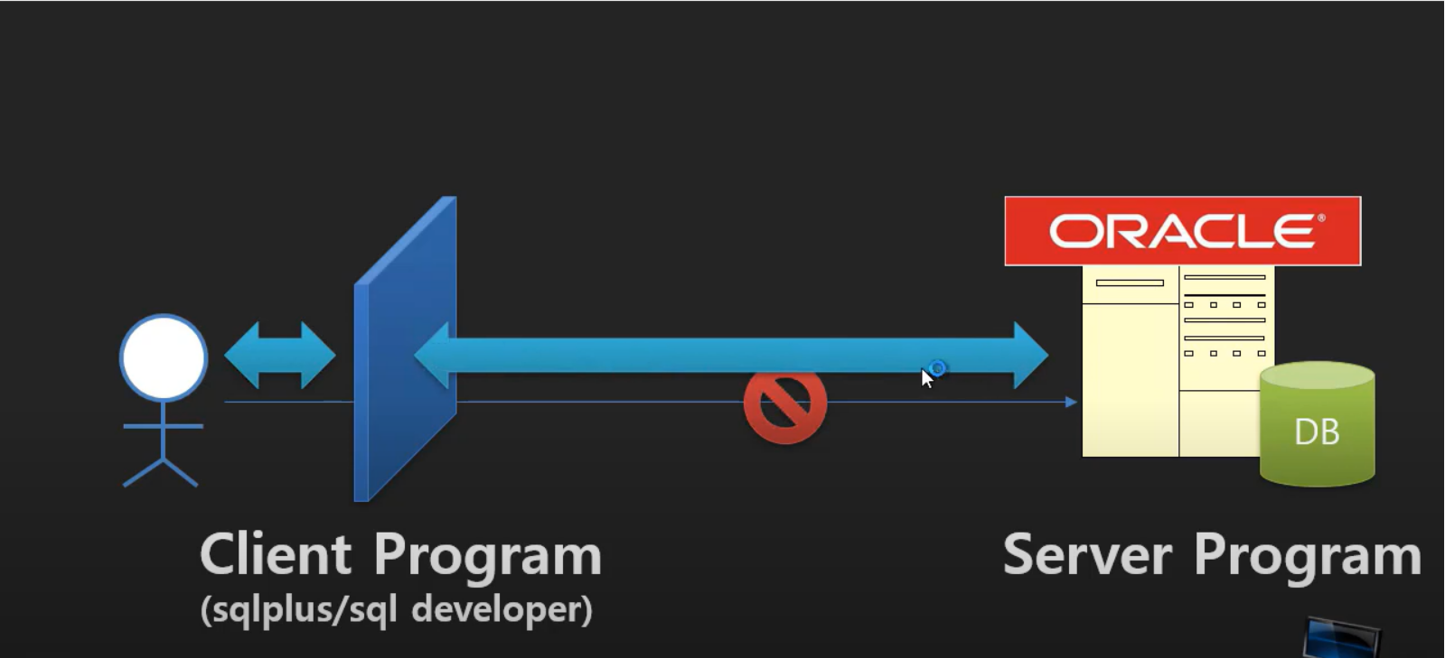 이렇게 사용자는 오라클에 직접 접근이 불가능 하므로 DBMS에 SQL을 사용할 수 있는 인터페이스가 필요한데, 그것이 바로 sqlplus/ sql developer 등이다. 다시말하지만 오라클은 에디터나 IDE 가 아닌 관리 시스템 이다. 즉 오라클에 사용자가 직접 SQL을 넣을수 있는 방법은 없다. 무조건 다른 Client Program을 사용해야 한다.