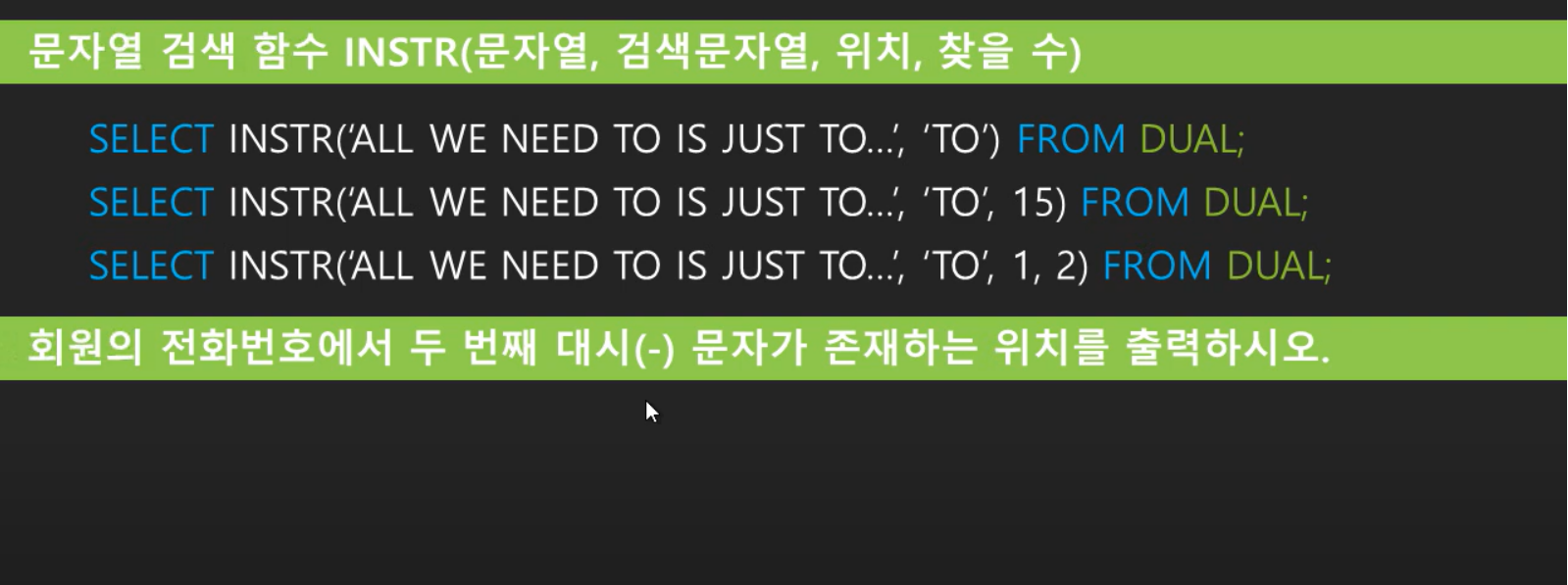 INSTR : 문자열에 포함된 문자가 어느 위치에 있는지 숫자를 반환하는 함수.