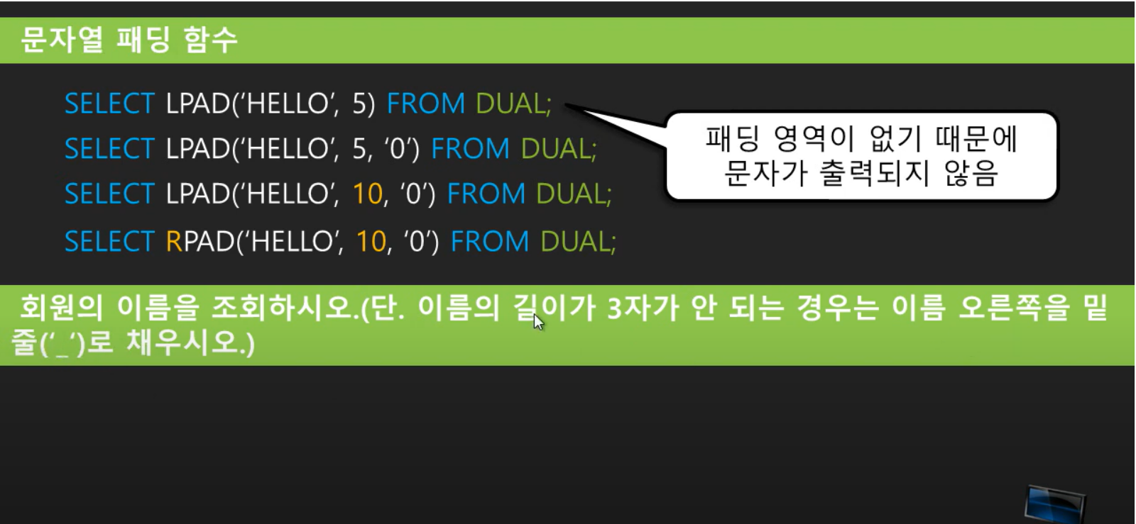 LPAD(문자1, 5, 문자2) 의 뜻은 문자 1을 5자리수만 출력할것인데, 만약 5자리 미만이라면, 왼쪽(Left)에 남는 자리만큼 문자 2를 채우라는 뜻이다.