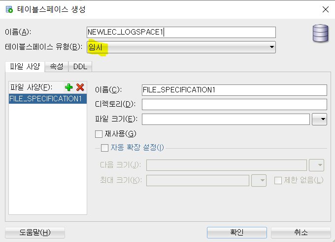 내가 생성해 준 임시 저장 테이블 스페이스인 NEWLEC_LOGSPACE와 NEWLEC_TABLESPACE1 이 보인다.