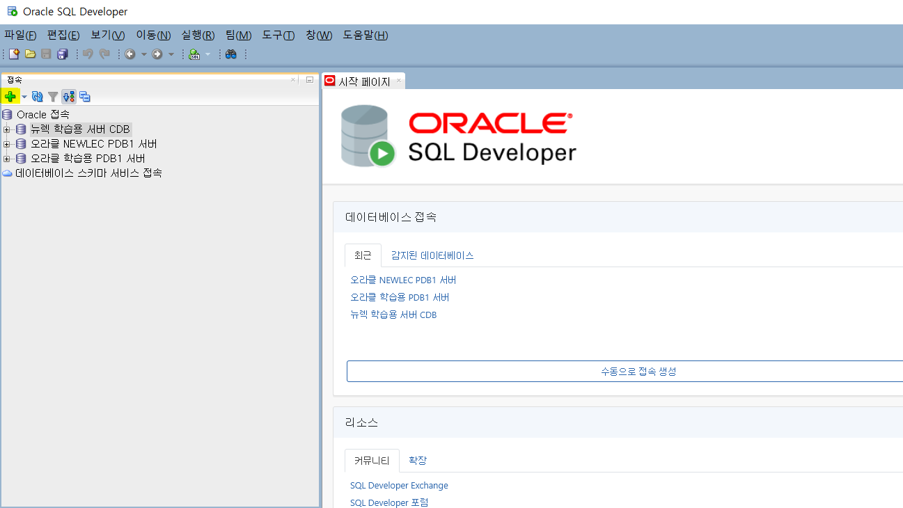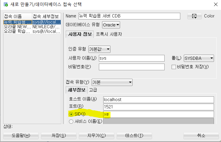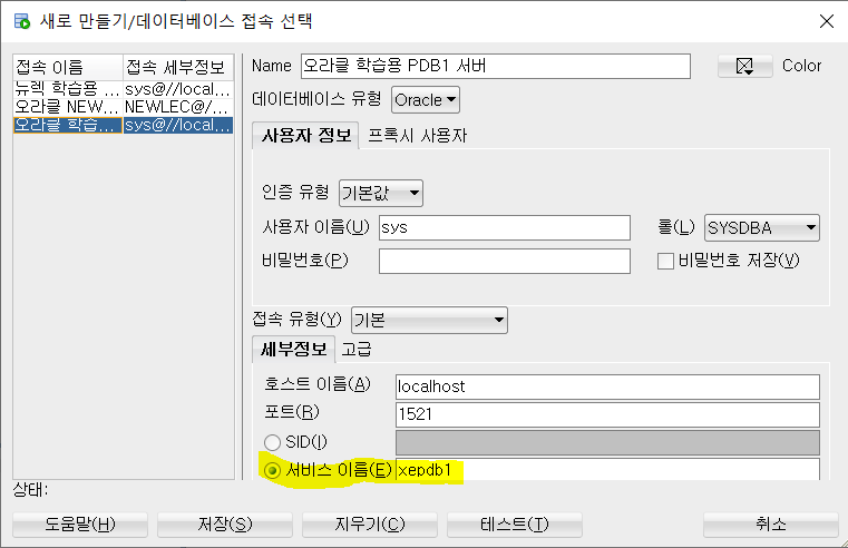 즉 글 맨 위 처음 서버를 만들 때는 CDB 서버(SID에 XE 넣은 것)을 만든 것이고, 이것은 CDB 속 가상 데이터베이스인 PDB를 xepdb1을 이용해 만든것이다.
