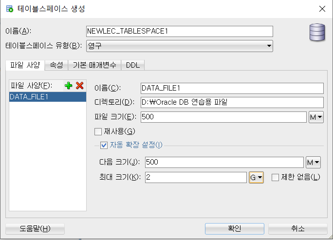 이 과정이 완료되면 DBA에 내가 만든 영구/임시 테이블 스페이스가 생성된다.