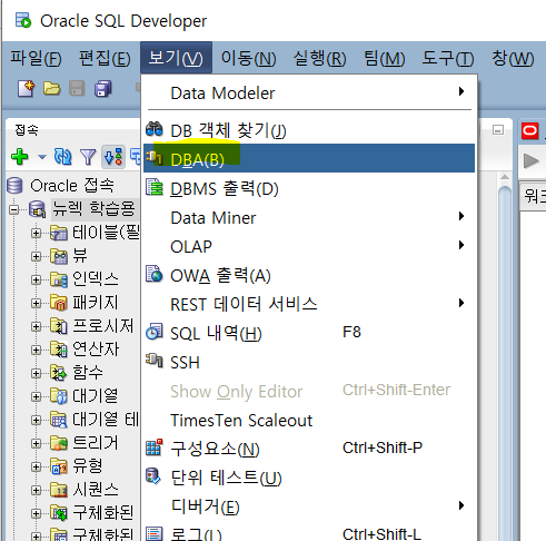 **테이블 스페이스 생성방법 보기->DBA 클릭 후, 아래 사진 참고.