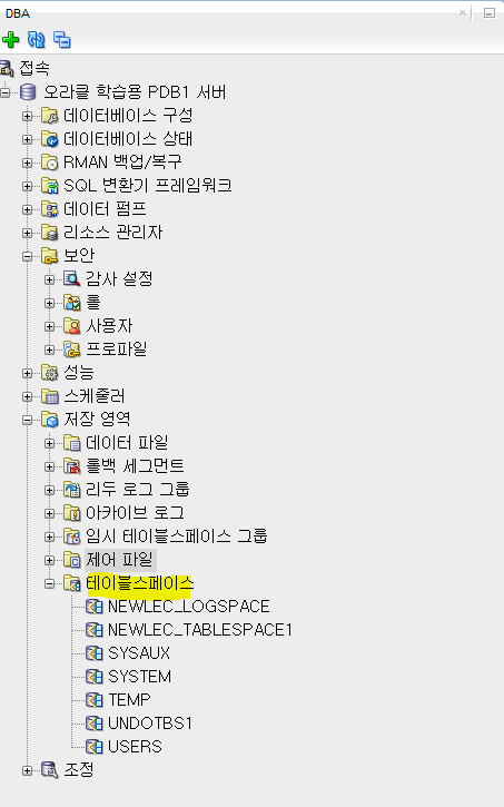 DBA를 클릭 후 DBA 창이 왼쪽 하단에 나오면, 형광팬 으로 + 버튼 누르면, 어느 서버에 접속할것인지 선택 가능하다. 이렇게 하면 아래와 같은 카테고리가 나오는데 여기서 테이블 스페이스를 추가해주면 된다.