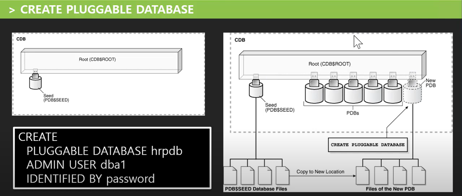 오라클은 버전이 업데이트 되면서, 기존에는 한가지 서버로만 사용했던 것들이, 이제는 서버안에 또 다른 가상의 서버를 만듬으로서 조금 더 쉽게 갈아끼우거나, 변경, 삭제 할수 있도록 만들었다. 또한 하나의 템플릿(서버의 틀)을 카피하며, 다양한 종류의 서버를 만들수 있도록 하였다. 그것이 바로 Pluggable database이다.