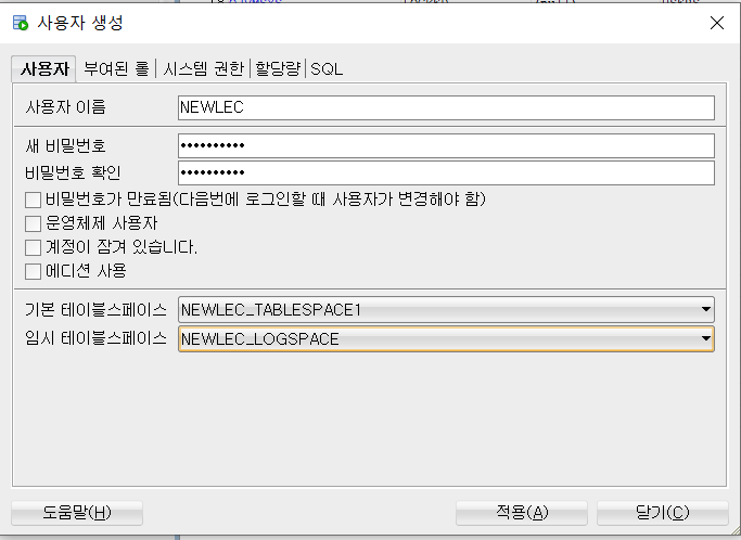또 새로운 사용자를 설정하는 과정에서(기존에는 sys라는 관리자 계정으로 서버에 접속했음) 그 사용자가 쓸 테이블 스페이스를 영구/임시 모두 설정해 주어야 하는데 여기서 방금 내가 생성했던, 테이블 스페이스를 지정해주면, 앞으로 이 NEWLEC이라는 사용자가 생성해서 접속하는 서버의 모든 테이블 저장소는 지정한 곳에 쓰인다.