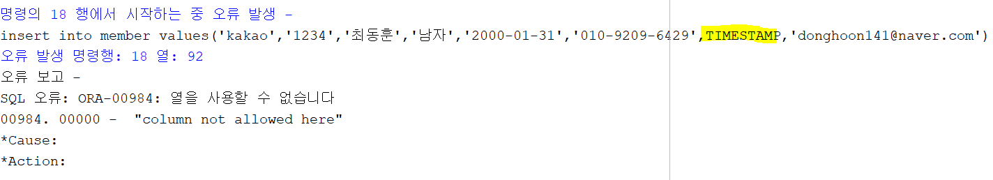 그런데 문제는 나는 DATE형으로 시간을 넣는 방법을 모른다. 그래서 또 찾아보니, systimestamp를 넣으면 된다고 나온다. 그래서 그렇게 넣어보았다.