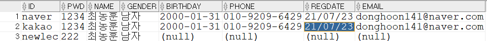 이러니 DATE 형식에 맞게 저장 되었다. -그런데 왜 오라클은 DATE 형 밖에 없는걸까? mssql은 datetime2 등 엄청 많던데..