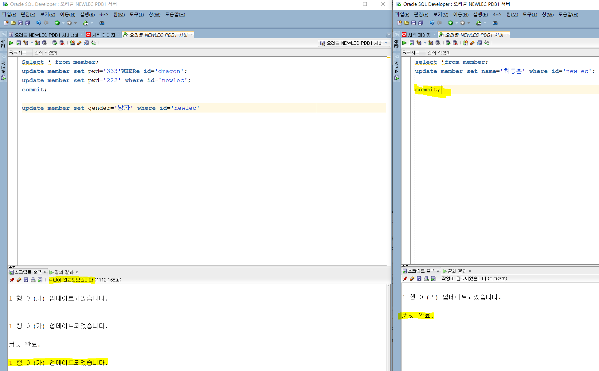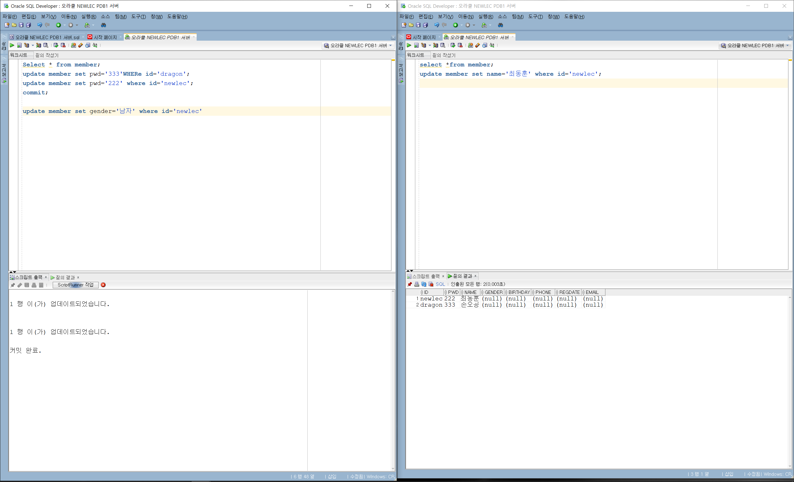 우선 서로다른 세션이 한 저장소에 접근하는것을 보이기 위해 SQL developer를 두번 열었다.
