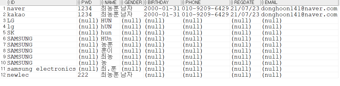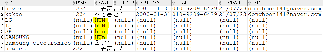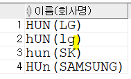 이렇게 HUN이라는 이름속에는 대/소문자가 혼재되어 있을경우 구별없이 출력하고자한다면 어떤 쿼리를 써야 할까?
