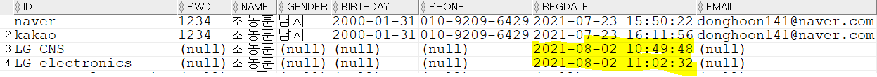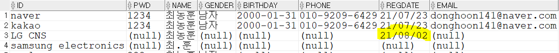 INSERT into member(ID,NAME,regdate) values('LG CNS', '최동훈', sysdate);
