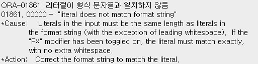 이렇게 함수가 된다. 또한 각 함수별로, 문자 포맷형식을 지정해서 그 형식에 맞는 문자/날짜/숫자 등을 변환해줄수 있는데 내가 이전 포스트에서 쓴 ALTER session set NLS_DATE_FORMAT = ' yyyy-mm-dd hh24:mm:ss'; 이 형식이 포맷팅 형식의 예이다.
