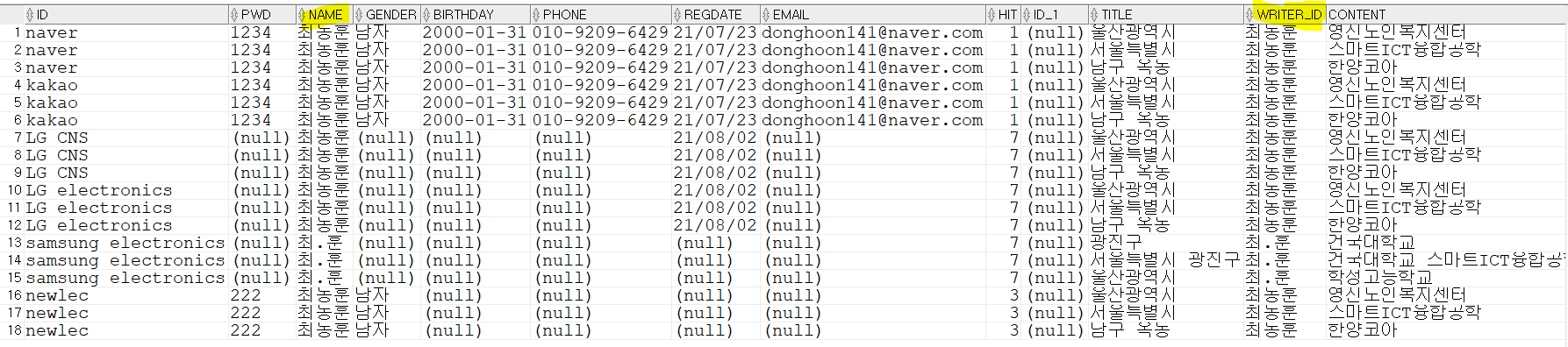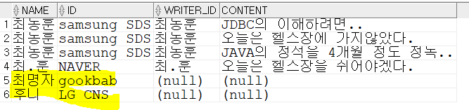 이 쿼리를 쓴다면 두 테이블을 "최동훈","최.훈"을 기준으로 인적사항과, 글 내용을 합칠 수 있다.