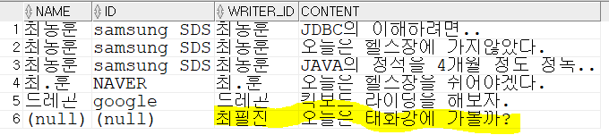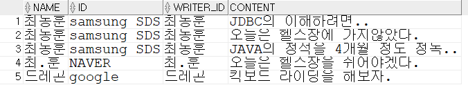 이런 두 테이블을 member 테이블을 부모테이블로 하여, NAME 과 WRITER_ID를 기준으로 합친 것이다.
