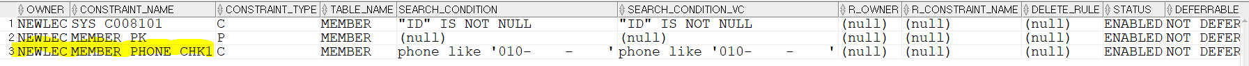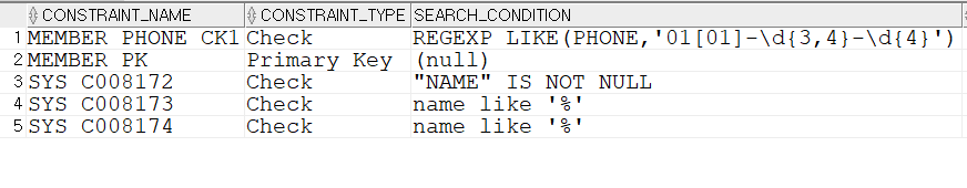 이렇게 하면 기존 MEMBER_PHONE_CK1 이라는 이름을 가진 제약조건이 member 테이블에서 사라진다.