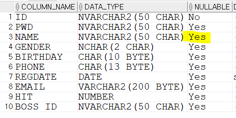 ALTER TABLE MEMBER MODIFY name nvarchar2(50) not null;