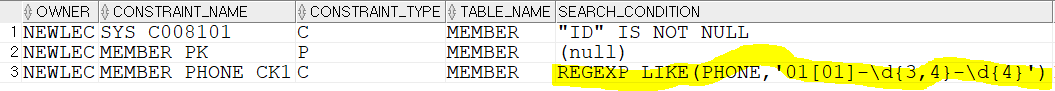 ALTER table member add constraint MEMBER_PHONE_CK1 check(REGEXP_LIKE(phone,'01[01]-\d{3,4}-\d{4}'));