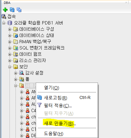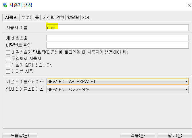 처음 내가 생각한 가설은, 같은 접속 서버 PDB계정에 새로운 사용자를 하나 만든뒤에, 기본저장공간과, 임시저장공간을 각각, NEWLEC이 쓰는 테이블 스페이스랑 똑같이 맞춰주면 되지 않을까..?? 였다.