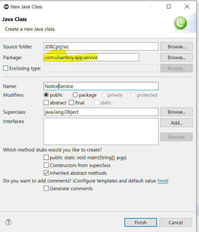 맨 먼저 SELECT 기능을 만들어 보겠다. 새롭게 자바 프로젝트 NOTICE SERVICE를 생성하고, select 문을 통해, 서버로부터 받아온 notice 레코드를 반환하는 함수를 작성했다.