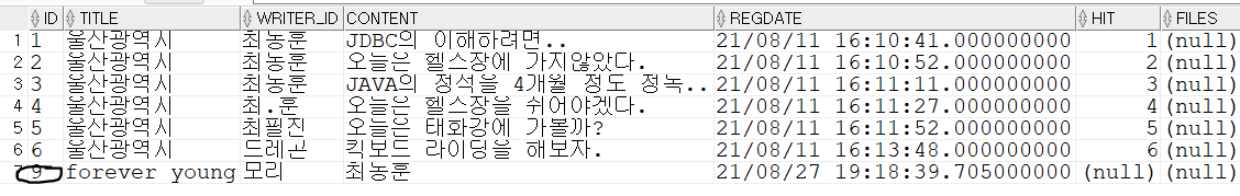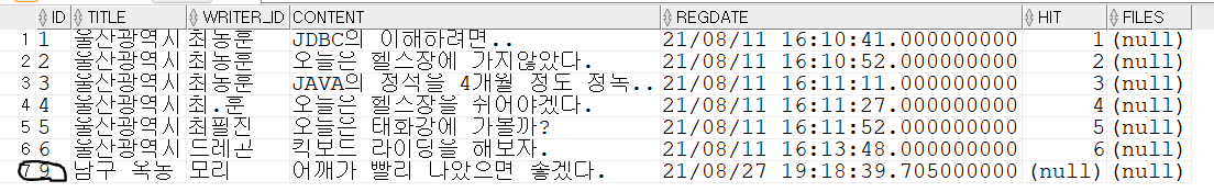 ="update notice set title='남구 옥동', content='어깨가 빨리 나았으면 좋겠다.' where writer_id='모리'";