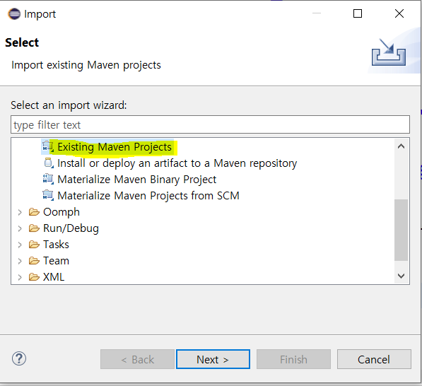이미 이클립스에 "기존에 만들어놓은 메이븐 프로젝트" 폴더를 import 할때 떳던 창에 힌트가 나와있었다. "Existing Maven Projects" 이미 존재하는 메이븐 프로젝트를 이클립스에서 "작업"만 한다는 뜻을 내포한다.