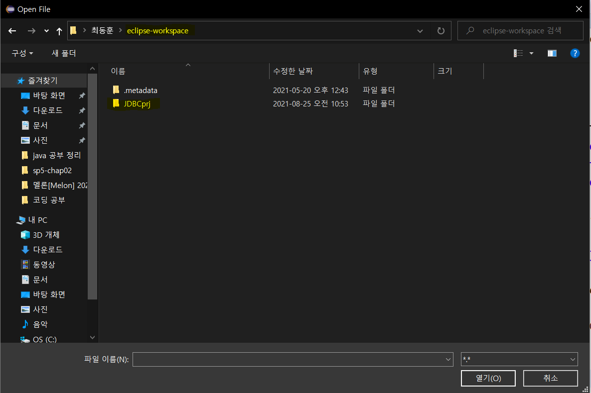 그런데 여기서 내가 "새로운 자바 프로젝트" 로 이클립스에 만든 JDBCprj는 이클립스의 WorkSpace에 저장된다.