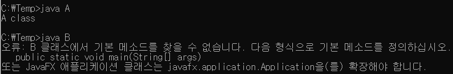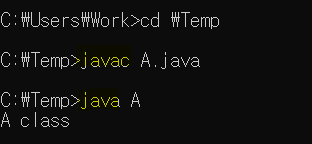 그 다음다시 자바 인터프리터(Java.exe)로 A 를 실행하니 "A class" 라는 문자열이 나왔다.