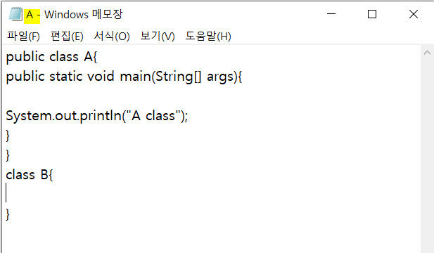 규칙에따라 A와 B라는 class를 생성한 뒤, C\Temp 파일에 A.java 란 이름으로 메모장을 저장했다.