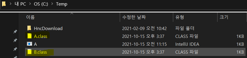 컴파일을 하니, 자바소스파일( .java) 가 있던 폴더에 내가 정의한 2개의 클래스 파일이 각각따로 생성된 것을 알 수 있다.(규칙 4번)
